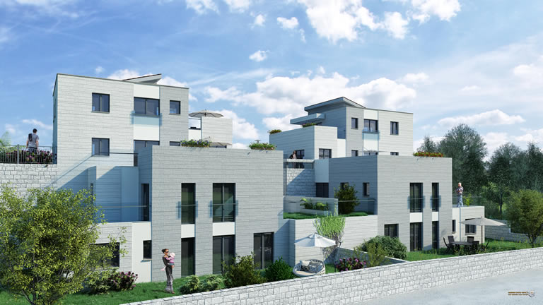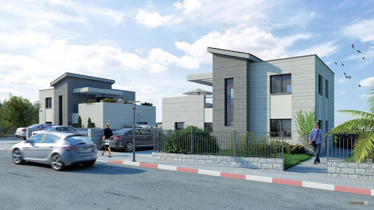 Set in the community of Dolev these residential units use large windows to open up to the views beyond. Careful combining of materials assists in developing the building form.