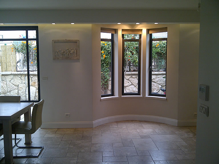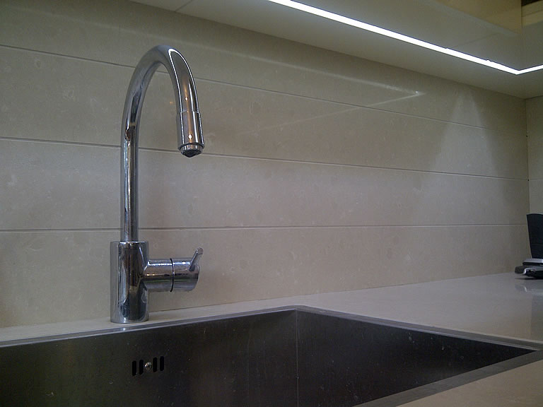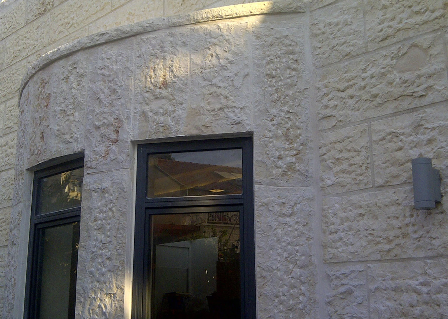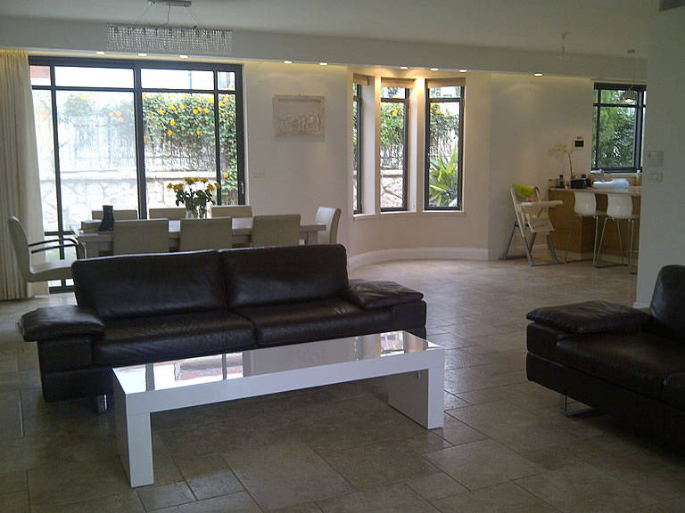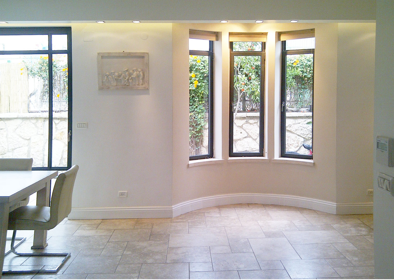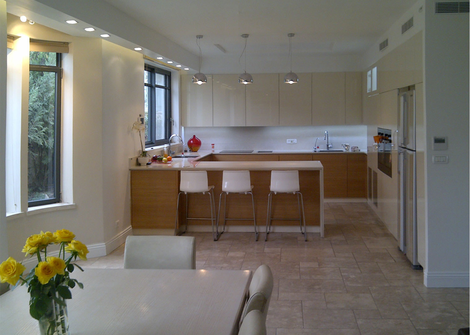 A yellow gray Mitzpe stone was chosen for the floor, stairs and window sills. The stone floors are laid using a 13 piece pattern with 4 varying stone sizes. This traditional stone contrasts with the modern cream glass kitchen upper cupboards and oak lower cupboards.