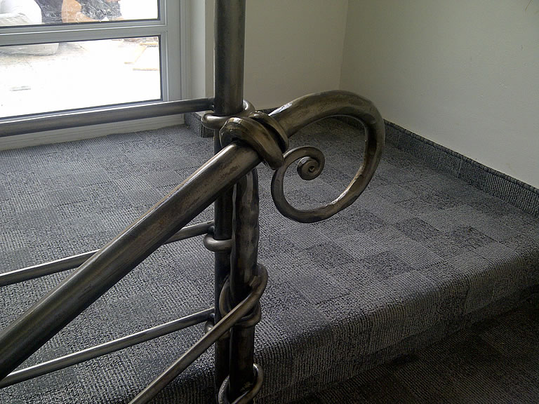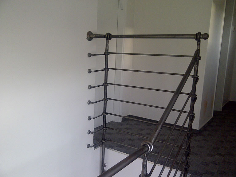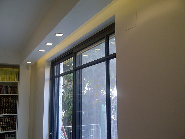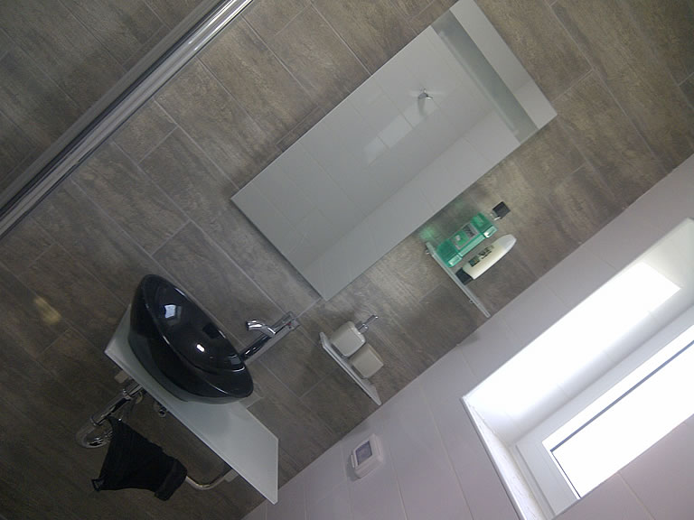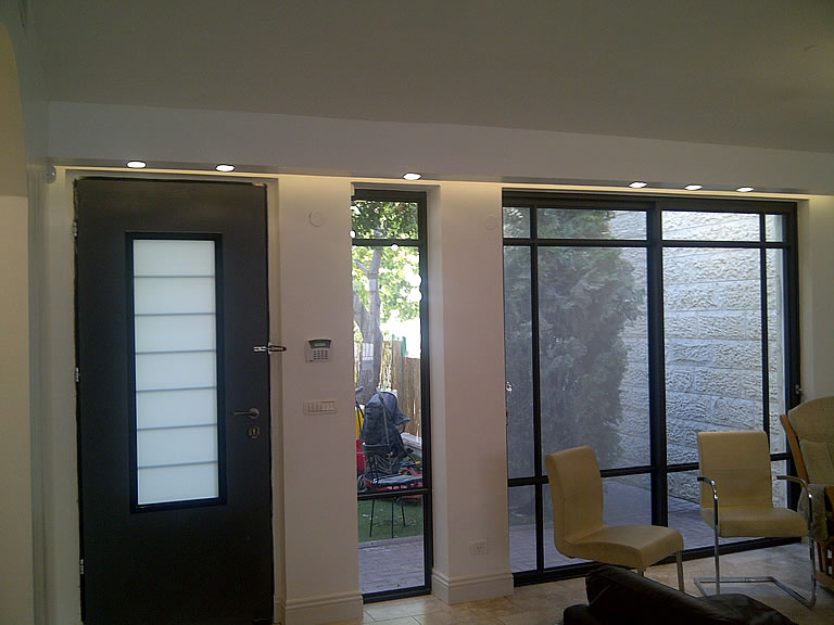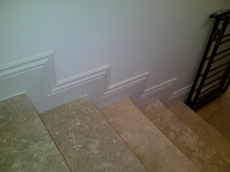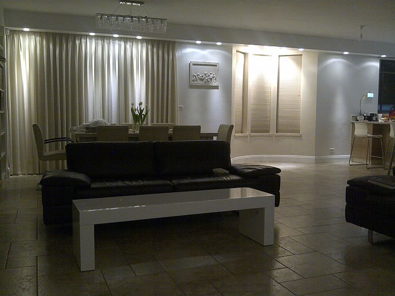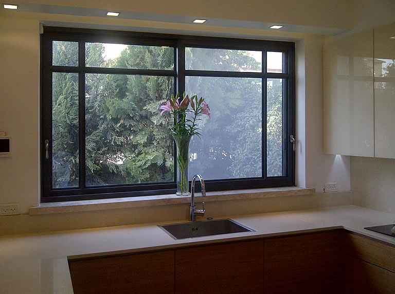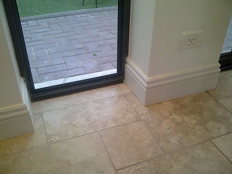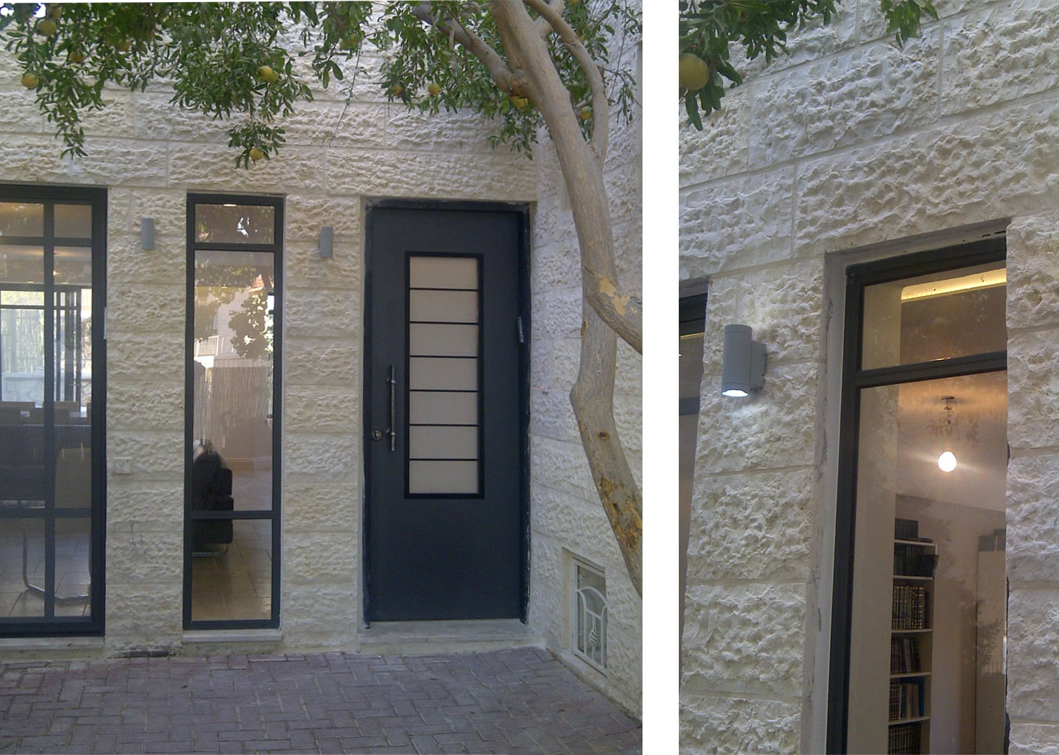 A yellow gray Mitzpe stone was chosen for the floor, stairs and window sills. The stone floors are laid using a 13 piece pattern with 4 varying stone sizes. This traditional stone contrasts with the modern cream glass kitchen upper cupboards and oak lower cupboards.