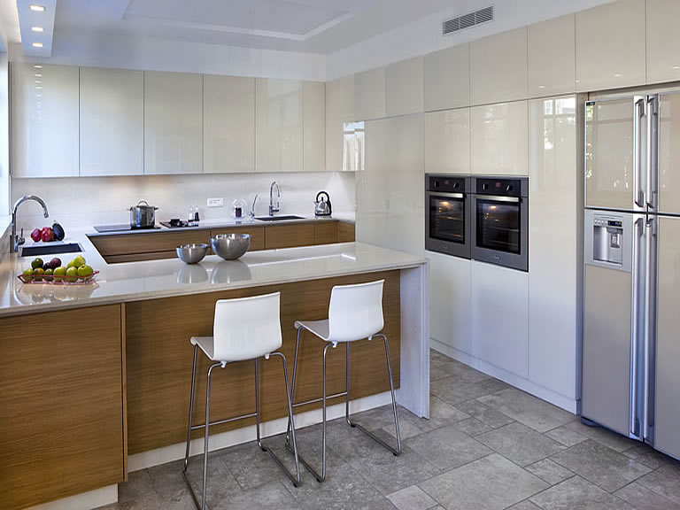 The kitchen design is concentrated for functionality with a bar island and a bank run for fridge freezer, ovens and microwave.