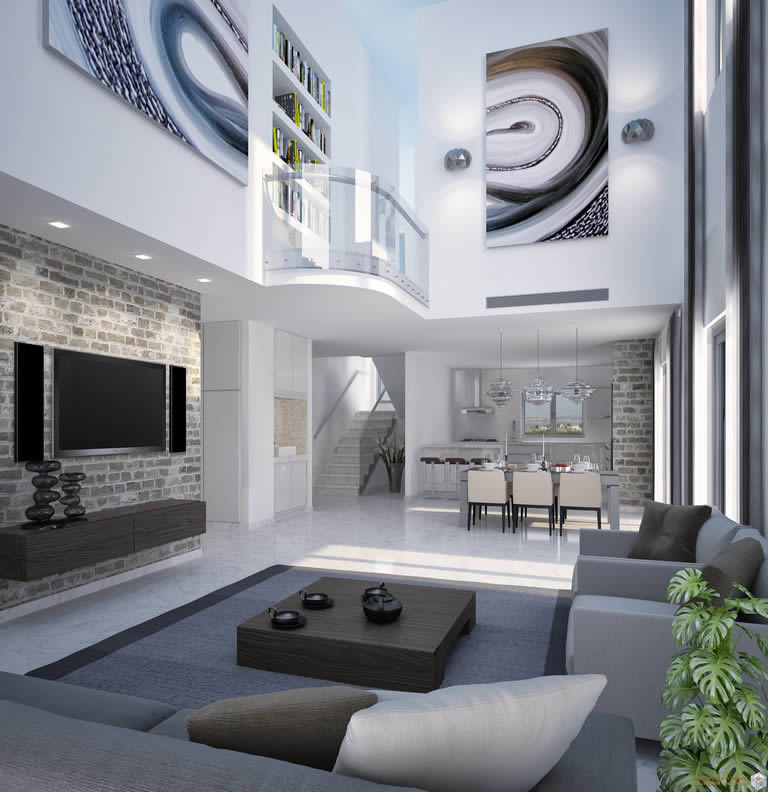 The interiors have a doubled height lounge dinning rooms overlooked by curved viewing galleries from the first floor.