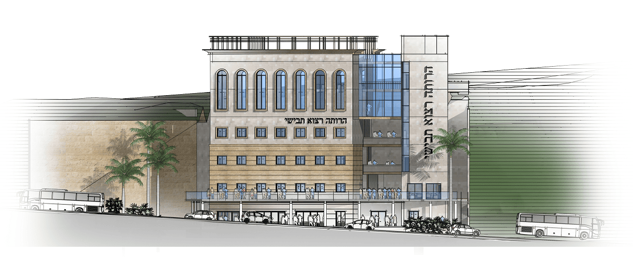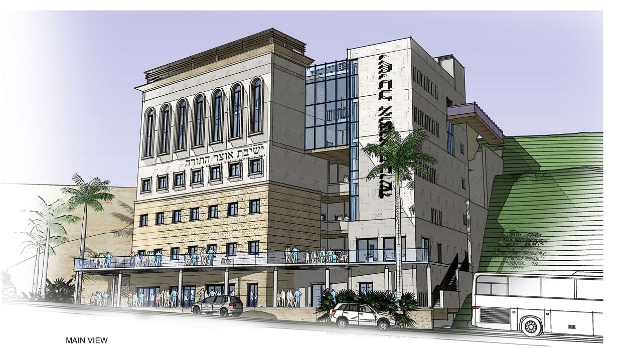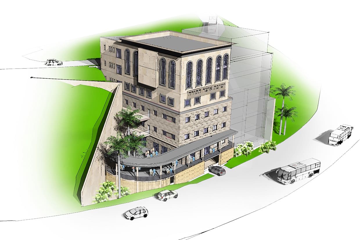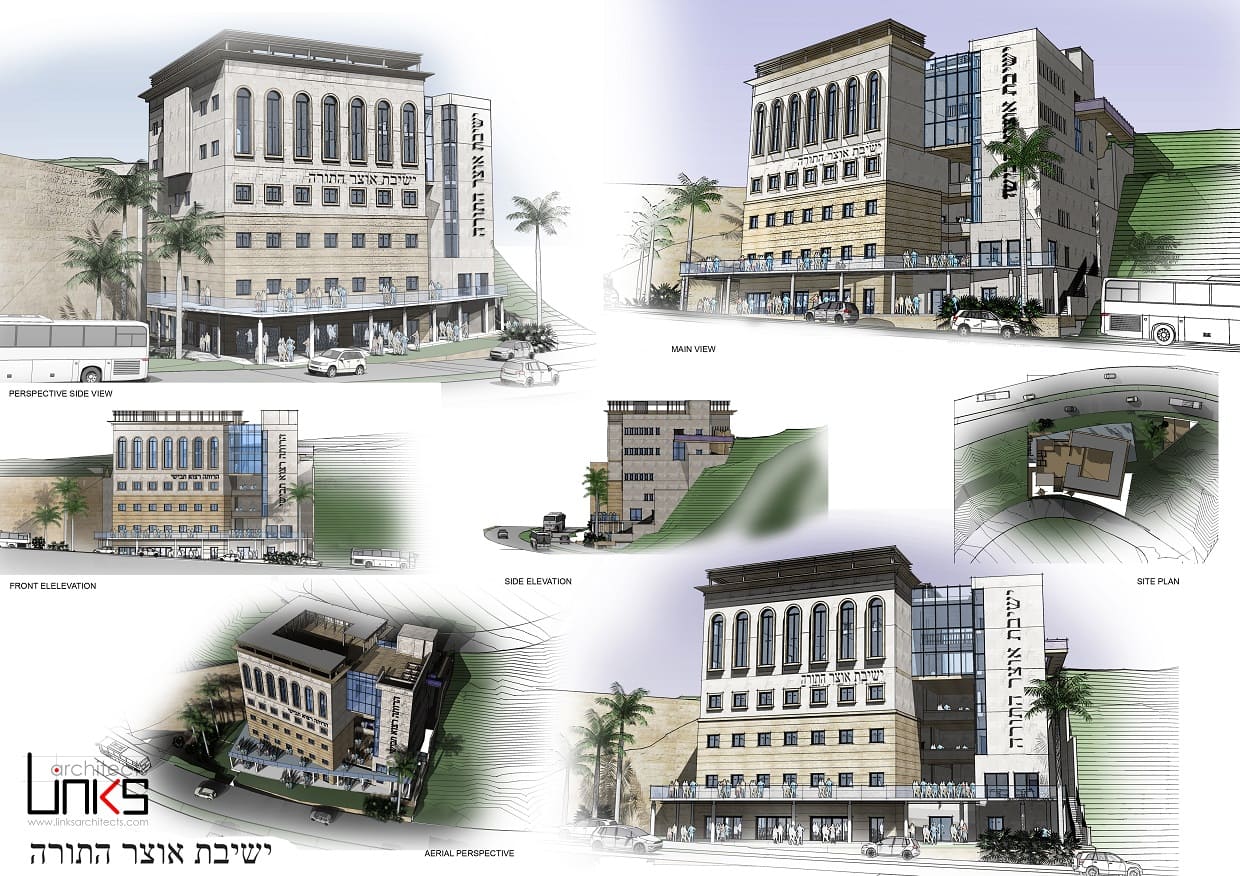 The site for this project in the Jerusalem neighborhood of Ramot sits between 2 roads with a steep topographical differential of over 20m. The building includes underground parking, a large dinning facility which spills out on to the raised terraces, 2 floors of dormitories, a floor of classrooms and Bet Midrash study hall with a double height spaces overlooked by a gallery on the upper level. The building is designed to accommodate 250 students.